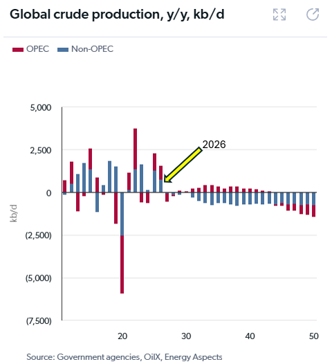 Como se puede ver, en 2026 se acaba el incremento de suministros y comienza un periodo de descenso en la producción mundial de petróleo.